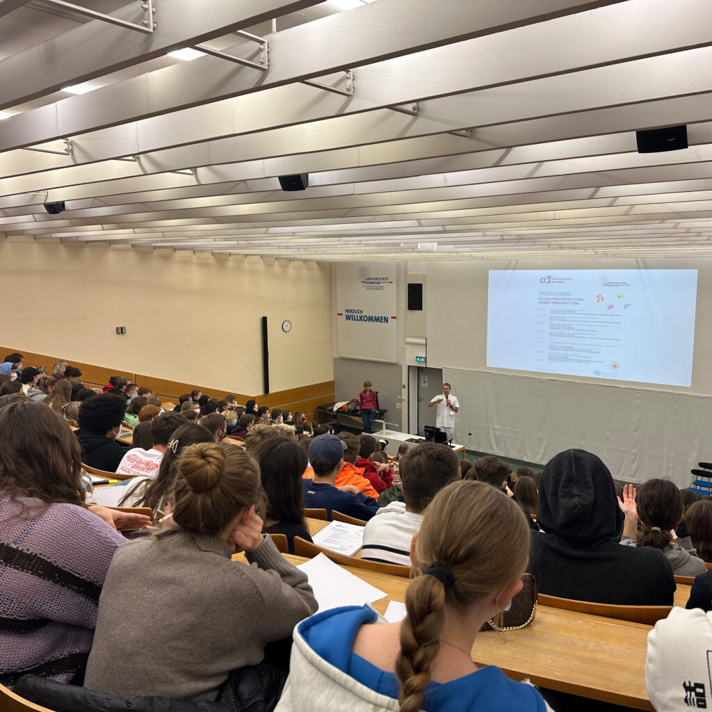 Ärzte und Wissenschaftler vom CCI erklärten 280 Freiburger Gymnasiasten am 25.11.2022 das Immunsystem und beantworteten deren Fragen. Die jährliche Schulveranstaltung war bis auf den letzten Platz ausgebucht. PROimmun hat sich vorgestellt und die Schüler während der Veranstaltung mit Essen und Getränken versorgt.